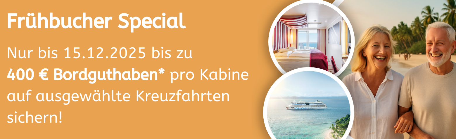 Erleben Sie Ihren AIDA Traumurlaub 2026 und sichern Sie sich mit dem AIDA Frühbucher Special ein attraktives Bordguthaben von bis zu 400 € pro Kabine*. Bei Neubuchung im Aktionszeitraum vom 20.11. bis 15.12.2025 profitieren Sie in den Tarifen COMFORT ALL IN, PREMIUM ALL IN und PREMIUM von extra Urlaubsgeld, das Sie ganz bequem an Bord für Getränke, Wellness, Landausflüge und vieles mehr nutzen können.