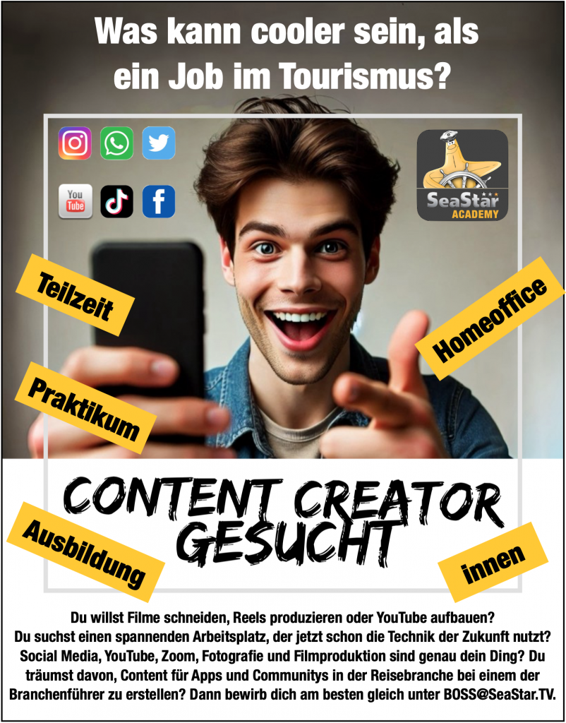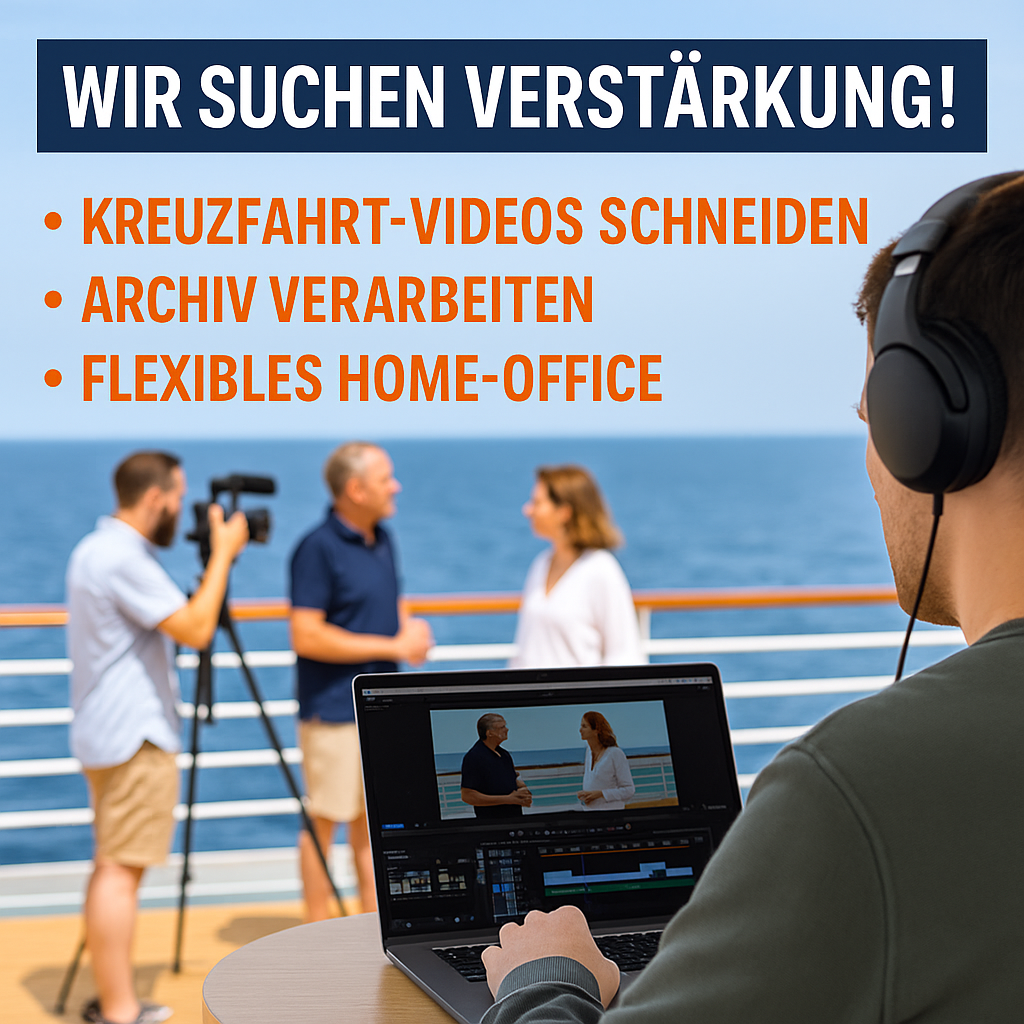Hey Content-Creator, Lust auf den besten Job der Welt? Wir suchen jemanden, der nicht nur Social Media und Webseiten rockt, sondern auch mal mit uns auf Kreuzfahrtschiffen die Kamera schwingt. Ja, richtig gehört: Büro in Sarstedt, eventuell Homeoffice, und zwischendurch Content produzieren, wo andere Urlaub machen. Wenn du also Bock auf ein modernes Reisebüro hast, das bundesweit zu den erfolgreichsten zählt und dich auf coole Schiffe schickt, dann meld dich. Wir versprechen: Langweilig wird’s garantiert nicht. Melde dich heute noch bei Martin Helmers und schicke deine Vita mit ein paar Beispielen, was du bisher so getan hast. Es wäre perfekt, wenn du dich mit Apple, WordPress, Newslettern, Instagram und Facebook, dem Werbemanager und Filmschnitt auskennst.