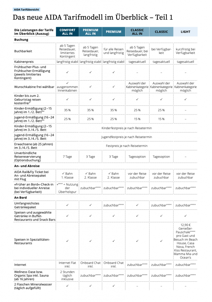 Bei AIDA können Sie für sich aus 6 Tarifen den passenden auswählen. Für die eher anspruchsvollen Gäste empfiehlt sich der „AIDA PREMIUM“ Tarif, für preisbewusste Gäste gibt es den „AIDA VARIO“ Tarif.