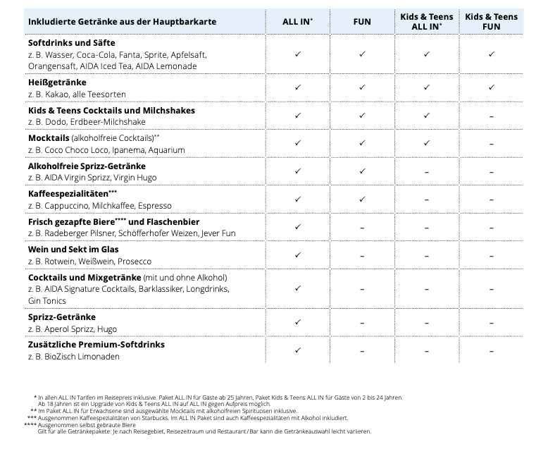 Gäste ab 25 Jahren erhalten bei einer Buchung des „PREMIUMAI“ oder „VARIOAI“ Tarif das Getränkepaket „AIDA Comfort Deluxe“, Gäste von 2 bis 24 Jahren das Getränkepaket „Kids & Teens Comfort“.